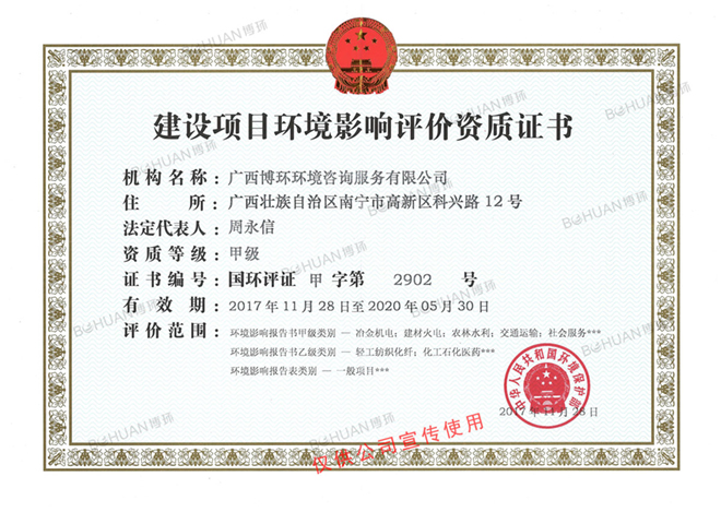 廣西博環(huán)環(huán)境咨詢服務(wù)有限公司系國有控股上市公司博世科( 股票代碼:300422)控股子公司,總部位于廣西南寧市,持有原生態(tài)環(huán)境部頒發(fā)的甲級建設(shè)項目環(huán)境影響評價資質(zhì)證書(證書編號:國環(huán)評證甲字第2902號)